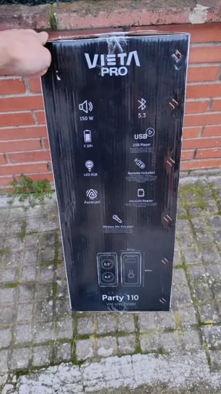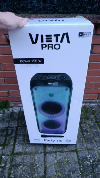 Vendo Vieta Pro Party 110, en perfecto estado y en su caja. Altavoz potente con 150 W de sonido, Bluetooth 5.3, luces LED RGB sincronizadas con la música y hasta 10 h de autonomía de batería, ideal para fiestas o eventos 🎉. Incluye micrófono inalámbrico para karaoke, mando a distancia, entradas USB, microSD y AUX, y funciona con la app Vieta Pro Audio. Tecnología Auracast para conectar varios altavoces compatibles y llenar de sonido cualquier espacio