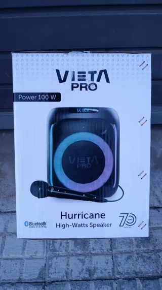 Vendo Vieta Pro Hurricane en muy buen estado y en su caja. Altavoz potente de hasta 100 W con Bluetooth 5.0, woofer y tweeter integrados para buen sonido y graves sólidos. Tiene entradas USB, SD/TF, jack 3,5 mm y jack grande 6,5 mm, además de modo True Wireless (TWS) para emparejar con otro Hurricane y tener sonido estéreo. Batería con hasta ~15 h de autonomía y transmisión Bluetooth estable. Perfecto para música en casa o exterior, sonido potente y fácil de usar.