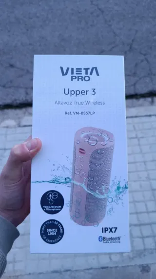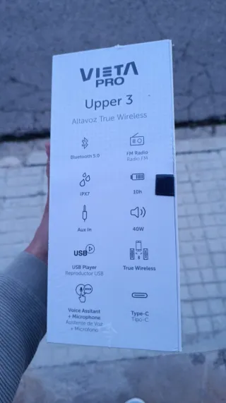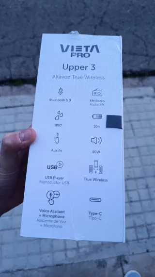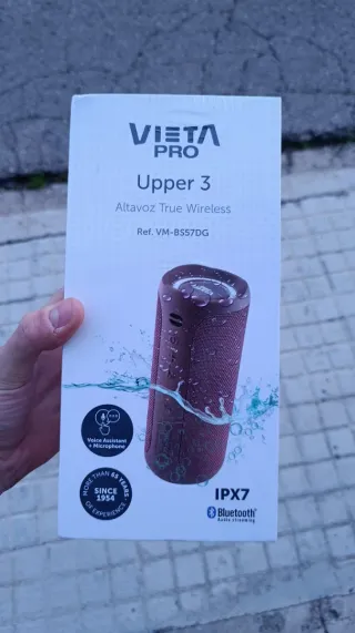 Vendo Vieta Pro Upper 3 en color burdeos, en perfecto estado y en su caja, sin abrir! Es un altavoz portátil Bluetooth 5.0 con sonido potente de 40 W, resistencia al agua IPX7 para uso en exterior, batería de hasta 10 h, radio FM, micrófono integrado y entradas USB, AUX y USB-C. También permite emparejar dos unidades vía True Wireless Stereo (TWS) para sonido estéreo. Perfecto para música en casa, terraza, playa o piscina.
