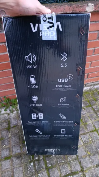 Vendo Vieta Pro Party 11, en perfecto estado y en su caja. Altavoz potente con 150 W, Bluetooth 5.3 y luces RGB para ambiente de fiesta 🎉. Batería de hasta 10 h. Incluye micrófono para karaoke y dispone de entradas USB, microSD y AUX. Permite emparejar otro altavoz mediante TWS para sonido estéreo. Graves potentes, alto volumen y muy fácil de usar.
