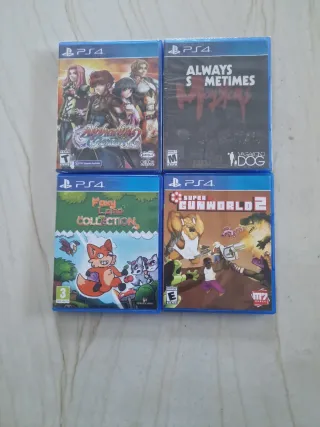 Conjunto de cuatro videojuegos para PlayStation 4. - Alphadia genesis precintado - Always Sometimes Monsters precintado - Foxy Land Collection - Super Gunworld 2 Oportunidad de llevarte 4 juegos de los que luego no encontraras a un precio de risa Trato en mano