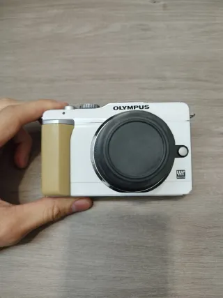 Cámara Olympus EPL1 en color blanco y beige. Un diseño compacto y elegante. - Cuerpo principal en blanco. - Empuñadura lateral en color beige.