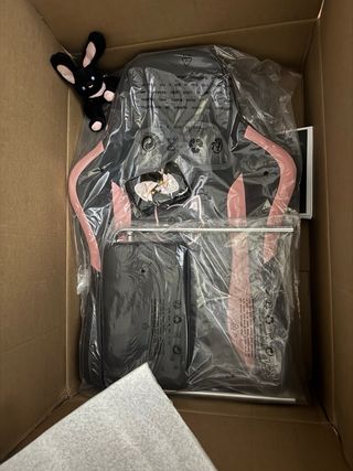 Silla gaming con un diseño moderno en negro y detalles en rosa. - Cojín lumbar con vibración y reposacabezas. - Orejas de gato decorativas y peluche. - Reposapiés extraíble. Ha sido abierta solo para montarla pero no cabe en la habitación. Silla gaming (180€) → vendo por 110€, no ofertas
