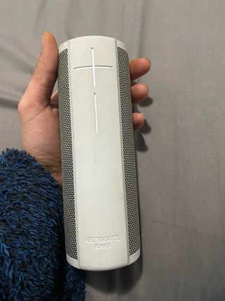 Altavoz portátil Ultimate Ears Blast en color gris y blanco. Diseñado para ofrecer un sonido potente y envolvente. - Diseño cilíndrico. - Revestimiento de malla. - Botones de control en relieve. - Tiene Alexa - Resistente al agua y al polvo. - Conectividad Wi-Fi y Bluetooth.