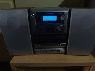 Mini cadena estéreo con reproductor de CD, radio y cassette. - Diseño compacto y moderno. - Altavoces integrados para un sonido claro. - Pantalla digital para información de la pista.