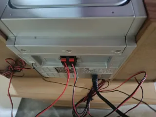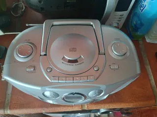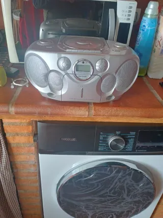 Radio compacta con múltiples funciones de audio. Funciona la radio y mando a la perfección. - Diseño moderno en color negro y plateado. - Los dol altavoces funcionan bien. - Puerta del casette no se abre ya que le falta un muelle en su interior. - No reproduce CD, se queda en blanco.