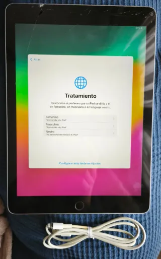 iPad de Apple en color plata. 32gb funciona perfectamente pero la pantalla está un poco partida por el borde superior