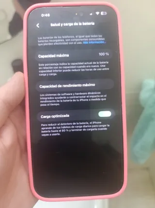 Teléfono móvil en color rosa. - Capacidad máxima de batería al 100%. - Carga optimizada activada para el cuidado de la batería.