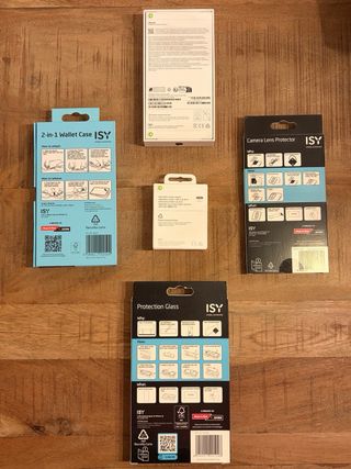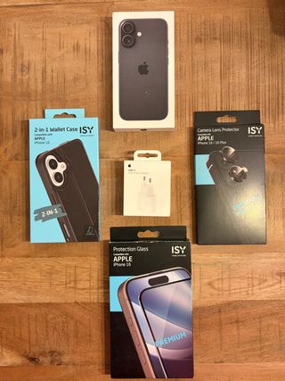 Pack completo iPhone 16 en color negro, todo precintado, a estrenar! - iPhone 16 (negro) 128GB - Cargador Apple USB-C 20W - Funda ISY 2-en-1 Wallet Case - Protector de cámara ISY - Protector de pantalla ISY
