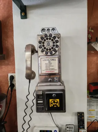SOLO VENTA EN PERSONA. A RECOGER A PARTIR DEL DÍA 21 DE FEBRERO Teléfono de pared estilo retro de la marca Crosley, modelo de 1957. - Diseño clásico con dial giratorio. - Acabado plateado y negro. - Ideal para coleccionistas o decoración. - Funciona.