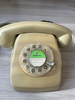 Teléfono fijo de disco de la marca Telefónica en color beige. Un clásico para tu hogar. - Diseño retro con dial giratorio. - Cable en espiral. - Incluye cable de conexión.