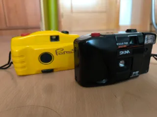 Se venden dos cámaras de fotos de carrete, una amarilla y otra negra. Son cámaras sencillas y divertidas para iniciarse en la fotografía analógica. - Cámara amarilla Paradise. - Cámara negra marca SKINA, modelo SN-102. - Ambas son Focus Free.