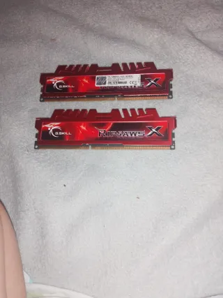 Dos módulos de memoria RAM G.Skill RipjawsX. - Capacidad total de 16GB (2x 8GB). - Tipo DDR3. - Velocidad PC3-12800 (DDR3-1600). - Diseño en color rojo y plateado.