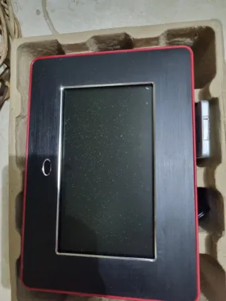 Marco de fotos digital con un diseño moderno y elegante. - Marco exterior de color negro con detalles en rojo. - Pantalla de visualización. - Botón circular en la parte frontal.