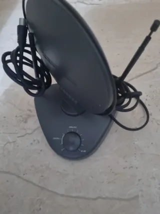 Antena para televisión con selector de modo digital y analógico. Su diseño circular y base le otorgan estabilidad. - Base estable. - Selector de modo. - Cable de conexión incluido.