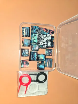 Conjunto de teclas personalizadas para teclado con un diseño inspirado en Grand Theft Auto: San Andreas. - Diseño temático de GTA: San Andreas. - Incluye varias teclas con diferentes ilustraciones. - Vienen en un estuche transparente para guardarlas. - Se incluyen herramientas para el cambio de teclas.