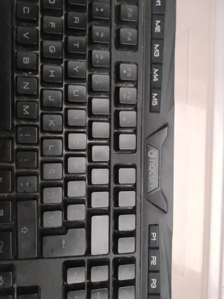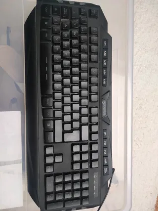Teclado de ordenador con diseño moderno y teclas personalizables. - Teclas M1 a M5 para macros. - Teclas P1 a P3 programables. - Botón Win Lock para evitar interrupciones.