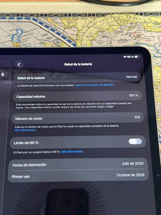 iPad Air M2 de 128GB en color gris/plata, con Smart Folio Keyboard incluido. La batería tiene una capacidad máxima del 100% y 109 ciclos de carga. Garantia hasta 19/10/2027 (adjunto factura Orange) Con cajas y cable original - Capacidad: 128GB - Incluye Smart Folio Keyboard - Salud de la batería: Normal - Capacidad máxima: 100% - Número de ciclos: 109 - Límite del 80% activado - Fecha de fabricación: Julio de 2024 - Primer uso: Octubre de 2024
