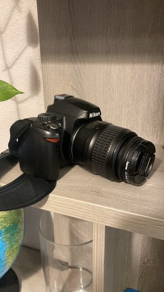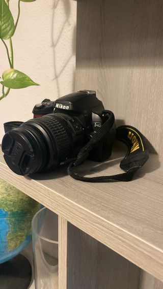 Cámara réflex digital Nikon D40 con objetivo. - Cuerpo de cámara negro. - Objetivo con tapa. - Correa para el cuello con logo.