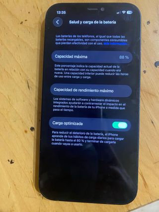 iPhone 12 en buen estado, listo para un nuevo dueño. La batería tiene una capacidad máxima del 88%. - Capacidad de almacenamiento: 128 GB. - Salud de la batería: 88%.