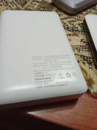 Batería externa portátil con carga inalámbrica. - Diseño blanco elegante. - Indicador de carga LED. - Puerto USB-C para carga rápida.