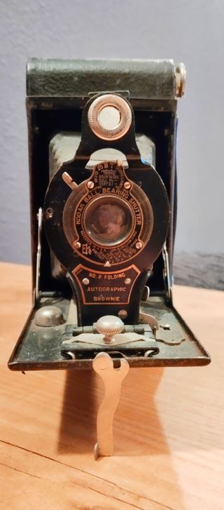 Cámara Kodak No. 2A Folding Autographic Brownie, un modelo clásico de colección fabricado por Eastman Kodak. Tipo: Cámara plegable de fuelle. Periodo: Producida aproximadamente entre 1915 y 1926. Película: Utilizaba película de formato 120 para negativos de 2 1/4 x 3 1/4 pulgadas. Característica: Cuenta con un obturador "Kodak Ball Bearing Shutter". - Modelo plegable. - Diseño clásico en color negro y marrón.