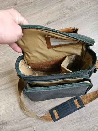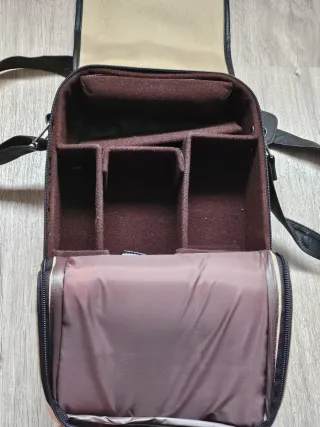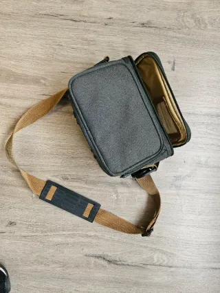 Bolso de tela gris para cámara con interior forrado en color dorado. - Correa ajustable de tela color camel. - Compartimento principal con cremallera. - Asa acolchada para la correa. NO LEER - Nikon Canon Pentax Olympus Yashica Mamiya Contax Leica Sigma Kenko Tamron Tokina Sony Vivitar Minolta Minox Rollei Voigtlander Zeiss Lowepro Kata Vanguard Manfrotto Benro
