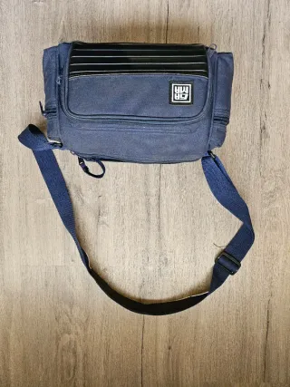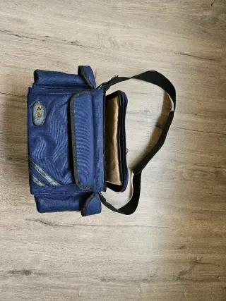 Bolso de color azul con el logo DH en la parte frontal. Tiene un diseño práctico con varios compartimentos. - Compartimento principal con cierre. - Bolsillos adicionales en la parte delantera. - Correa ajustable para llevar al hombro. NO LEER - Nikon Canon Pentax Olympus Yashica Mamiya Contax Leica Sigma Kenko Tamron Tokina Sony Vivitar Minolta Minox Rollei Voigtlander Zeiss Lowepro Kata Vanguard Manfrotto Benro