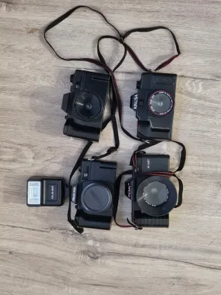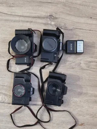 Conjunto de cuatro cámaras fotográficas. - Dos cámaras de la marca Kinusa. - Dos cámaras de la marca Mekai. - Todas las cámaras son de color negro. NO LEER - Nikon Canon Pentax Olympus Yashica Mamiya Contax Leica Sigma Kenko Tamron Tokina Sony Vivitar Minolta Minox Rollei Voigtlander Zeiss Lowepro Kata Vanguard Manfrotto Benro