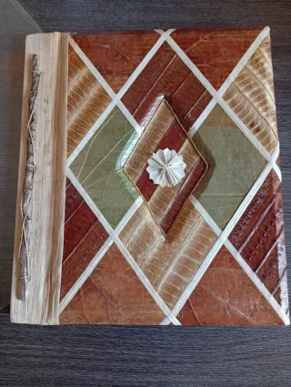 Álbum de fotos con un diseño único y artesanal. - Cubierta decorada con hojas secas y madera. - Estilo rombos en tonos marrones y verdes. - Detalle central en forma de flor. - 10 paginas para 80 fotos