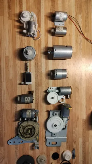 Lote variado de motores eléctricos de corriente continua perfectos para pequeños proyectos. Los tengo guardados y no los uso, por eso los vendo. Todos funcionan perfectamente. Incluyo algunas correas, poleas y piñones.