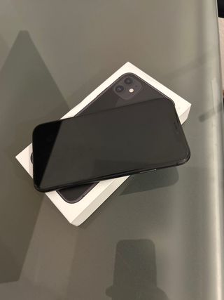 Teléfono móvil iPhone 11 con acabado en color negro y 128GB de almacenamiento. Pantalla de 6.1 pulgadas, en buen estado con alguna marca de uso en el exterior, funciona perfectamente. Salud de batería al 86%. Viene con caja original.