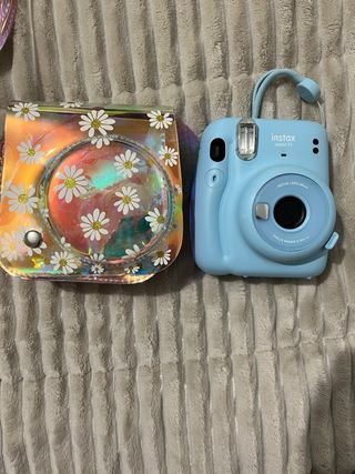 Cámara instantánea Fujifilm Instax Mini 11 en color azul. Perfecta para capturar momentos especiales. - Diseño compacto y ligero. - Flash integrado para fotos con poca luz. - Lente de 60mm para un enfoque nítido. -Usada por adulto -Incluye funda que no hace falta sacar la cámara de ella para echar la foto. -Buena calidad de fotos -Incluye un carrete nuevo -Solo tiene el uso de un carrete es decir 10 fotos no usada más