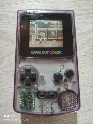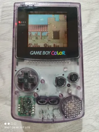 Consola portátil Game Boy Color con carcasa transparente morada. Ideal para coleccionistas y amantes de los videojuegos retro. Dos juegos, y accesorio lupa. NO NEGOCIABLE. - Diseño transparente que permite ver el interior. - Botones y controles en color negro. No tiene sonido.