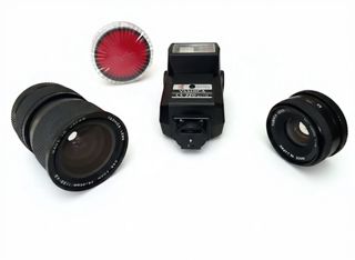 Conjunto de accesorios fotográficos que incluye dos objetivos para cámara analógica, un flash y un filtro. - Objetivo 28-80 mm Yashica. - Objetivo 50 mm Yashica. - Un flash Yashica CS-720 AUTO. - Un filtro UV.