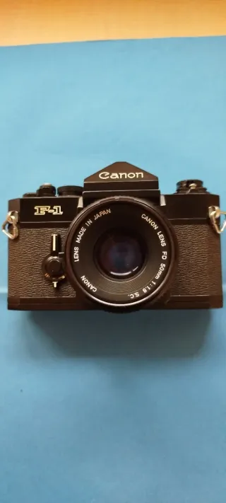 Cámara réflex analógica Canon F1 en color negro - Objetivo Canon Lens FD 50mm 1:1.8 S.C. - Fabricada en Japón. Modelo: Canon F-1 (versión original) con diales manuales. Objetivo: Canon Lens FD 50mm 1:1.8 S.C. (Super Canomatics). Funcionamiento: Utiliza un sistema de medición de luz donde una aguja del fotómetro debe alinearse con un círculo negro en el visor para lograr la exposición correcta. Entrega en persona.