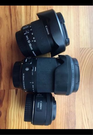 Se vende cámara réflex Canon EOS 600D junto con varios lentes. NO SE VENDE POR SEPARADO ES TODO JUNTO! - Lente Canon EF-S 10-18mm f/4.5-5.6 IS STM - Lente Canon EF 50mm f/1.8 STM - Lente Sigma 18-300mm f/3.5-6.3 DC OS HSM Contemporary - Correa EOS Digital NO se envía, solo en persona! Montura Canon eos 600d, objetivos: teleobjetivo sigma 18-300, canon 50mm fijo, canon 10-18 gran angular, trípode aluminio, dos filtros uno de ellos polarizado, dos cargadores 220w y usb, una batería, mando disparador, cajas de los objetivos, mochila y algunos accesorios que se ven en las fotos difuminador flas, pera de limpieza.