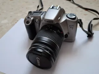 ¡¡NO HAGO ENVÍOS!! Cámara analógica Canon EOS 3000N en color plateado y negro. Opción perfecta para empezar con la fotografía analógica con calidad. Incluye: - Cámara Canon EOS 3000N - Objetivo (Canon EF 28–80mm) - 2 pilas necesarias para su funcionamiento - Carrete vacío listo para usar - 2 flashes externos - Funda para colgar, ideal para proteger la cámara. - Tapa del objetivo.