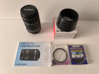 Objetivo Canon EF-S 55-250mm f/4-5.6 IS con estabilizador de imagen. - Incluye parasol Canon ET-60. - Incluye filtro UV - Incluye filtro Hoya CIR-Polarizing. - Incluye manual de instrucciones.
