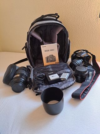 cámara reflex. Dos baterías, mochila, objetivos Canon 75-300 (teleobjetivo), 18-55 y 50 mm. Flash exterior incluido