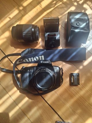 Canon en perfecto estado con todos los complementos, incluso un carrete listo para usar. Incluye 2 objetivos , flash y pila recargable. También bolsa. Precio negociable.