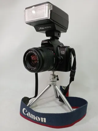 Cámara réflex analógica Canon EOS 500 con objetivo zoom EF 35-80mm y flash Metz 30B3i. - Cuerpo de cámara en color negro. - Objetivo zoom Canon EF 35-80mm f/4-5.6. - Flash externo Metz 30B3i. - Correa de Canon. - Trípode pequeño no incluido - Se puede ver y probar antes de comprar somos tienda. Envío a través de wallapop o recogida en nuestra tienda de Getafe.