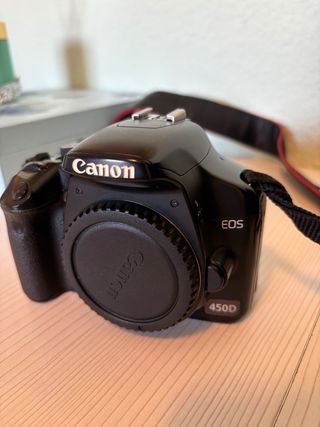 Cámara réflex digital Canon EOS 450D. -Objetivo 18-55mm. - Cuerpo de cámara en color negro. - Incluye tapa de objetivo. -Incluye 3 baterías, tarjeta SD 8GB, cargador y mochila.