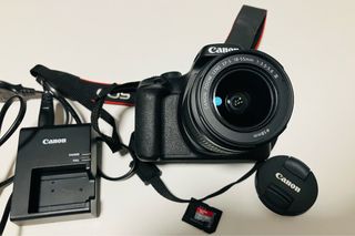 - Objetivo Canon Zoom Lens EF-S 18-55mm 1:3.5-5.6 III. - Cargador Canon con indicadores de carga. - Tapa de objetivo Canon. - Tarjeta de memoria SanDisk SD 64GB SE HA USADO SOLO 1 DÍA.