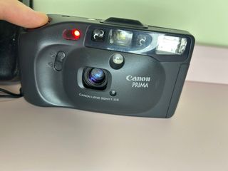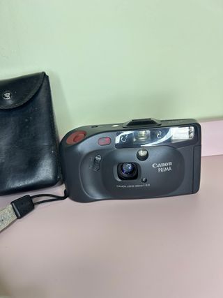 Cámara analógica Canon Prima en color negro. Incluye funda. Mando por infrarojos funcionando. no funciona el flash. Perfecta para fotos con buena iluminación . - Objetivo Canon Lens 35mm 1:3.5. - Flash integrado. - Correa de mano.