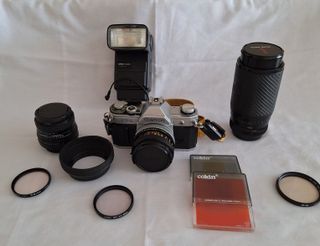Cámara reflex Canon AT1 en excelente estado. Totalmente operativa, funciona correctamente. Perfecta para iniciarse en la fotografía analógica, apta tanto para principiantes como para usuarios más expertos y coleccionistas de artículos vintage de los años 70. Incluye los siguientes objetivos, todos sin marcas ni ralladuras. Objetivo Canon 50mm 1:1,8. Objetivo gran angular Sigma 28mm 1:2,8. Objetivo Vivitar Series 170-210mm 1:2,8-4,0. Flash adicional Soltron MD881. Correa para colgar y cable disparador Protectores de objetivos y filtros Cokin. Bolsa de transporte.