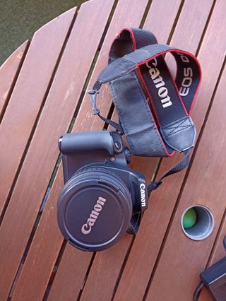 Muy cuidada Incluye objetivos de 18-55mm y 75-300 mm originales Canon cargador, una batería y manual de instrucciones. Sin ningún arañazo en los cristales de los objetivos. Solo tiene el desgaste donde se sujeta la cámara y que falta un protector para uno de los objetivos. También vendo aparte una funda solo para la cámara y una mochila para guardar todo . Echa un vistazo a mi perfil.