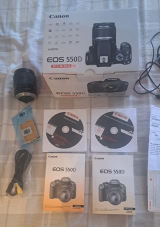 Vendo cámara Canon EOS 550D en perfecto estado. Incluye objetivo EF-S 18-55 IS II, bolsa de transporte, dos tarjetas SD, cable USB y manuales. Está prácticamente nueva. - Incluye dos tarjetas SD. - Objetivo EF-S 18-55 IS II. - Bolsa de transporte Canon. - Manuales en español y portugués. - Cable USB.