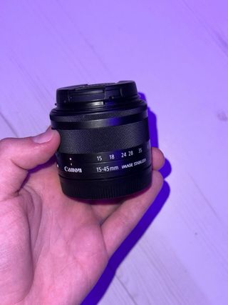 - Objetivo Canon EFM 15-45mm IS. En perfecto estado, apenas usado, es el lente kit que para iniciarse