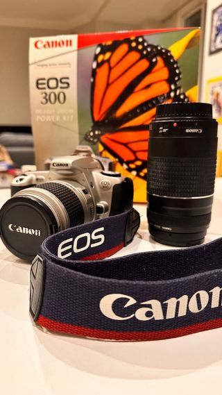 Cámara Canon EOS 300 junto con dos objetivos: 1. Canon Zoom Lens EF 75-300 mm 2. Canon Zoom Lens EF 28-90 mm Todos los productos estan en perfecto estado excepto el visor de la cámara que está empañado, se ve levemente disminuido. Hago envíos a península puntualmenre cuando me desplazo a Madrid todos los meses.